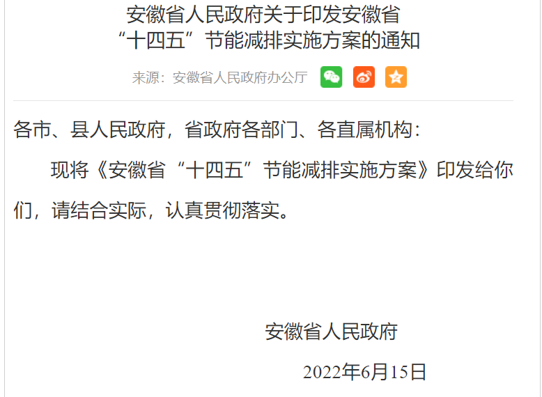 安徽省“十四五”節(jié)能減排實施方案 為認真貫徹落實黨中央、國務院關于碳達...